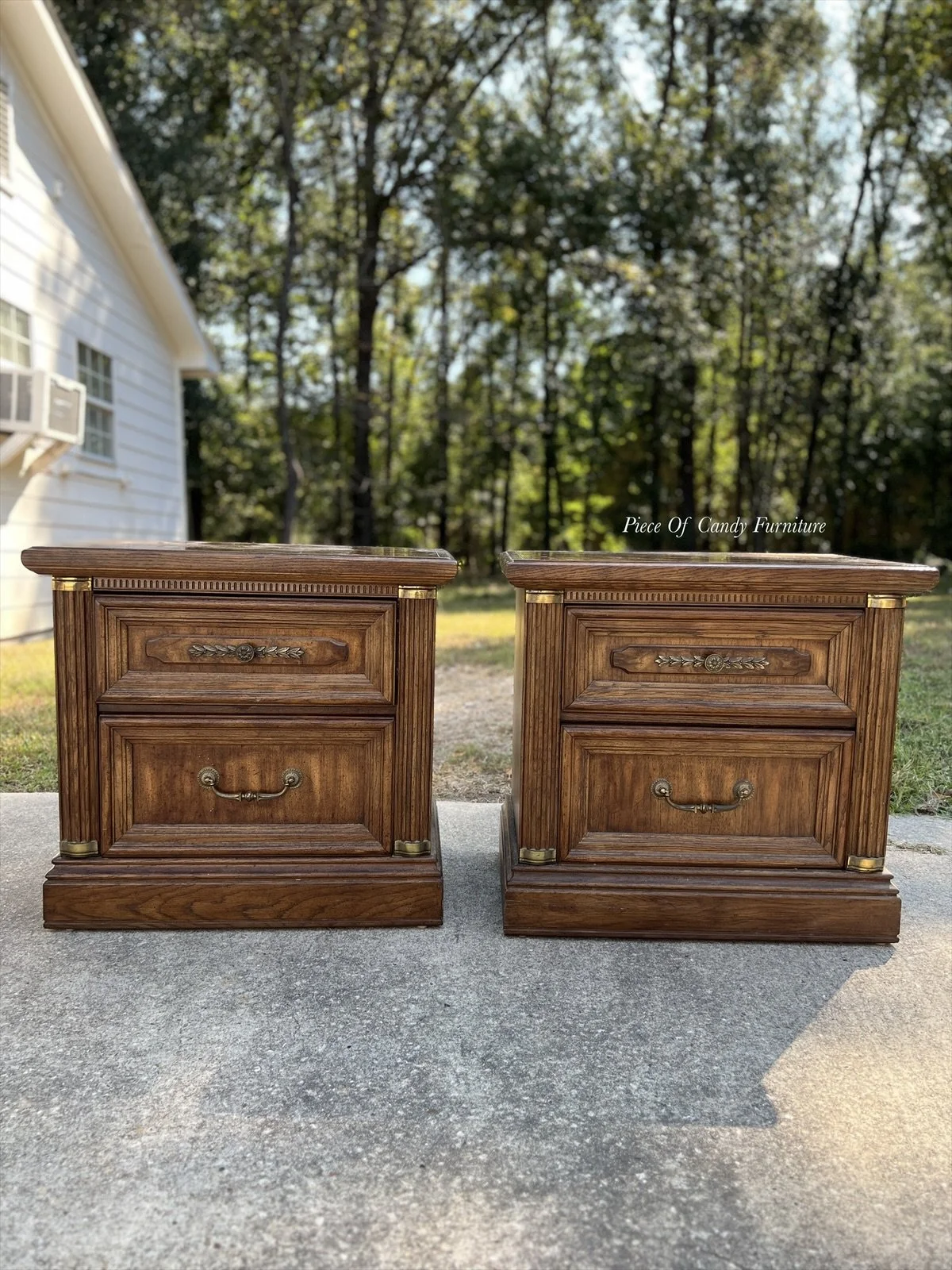 Vintage nightstands have two spacious dovetailed drawers. These were painted in black with tops stained in warm brown. Wood legs were added to make them taller. Removed the original hardware and added matte black knobs. Everything was top coated in a flat poly.