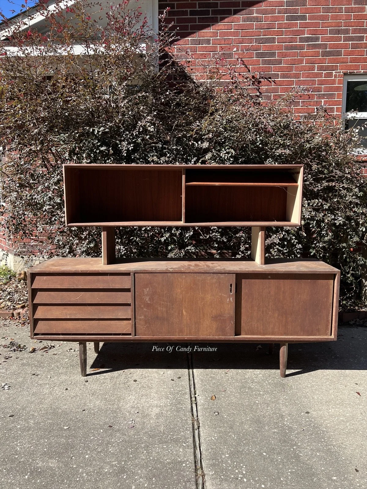 ully restored in a walnut stain and sealed in a semi gloss poly. Tol nner cabinets, inner top hutch, and inner drawers were conditione with scented furniture oil.