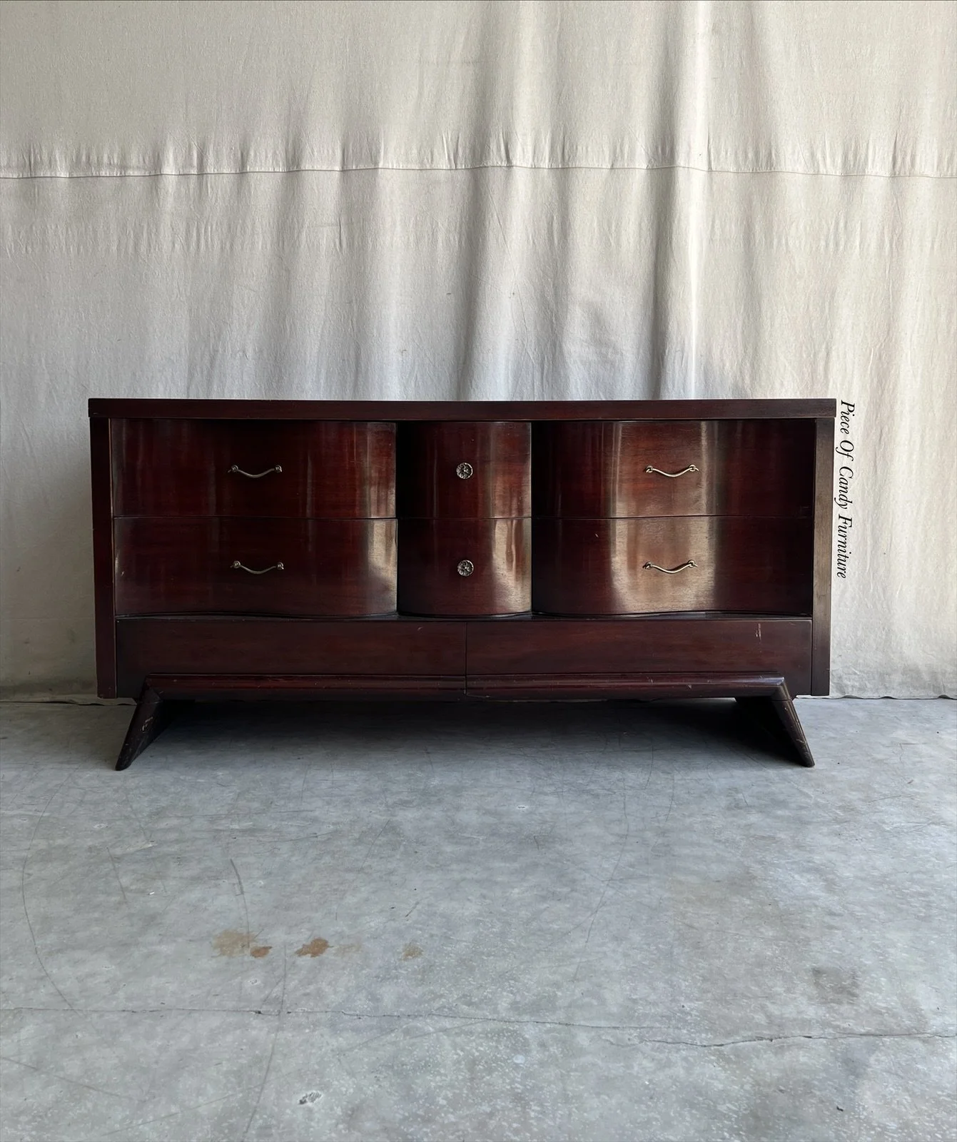 This early mid century dresser is from the 1950s era. These styles are from the atomic age that started the mid century movement. Basically the first editions. Solid wood with wavy mid section then goes down with a straight bottom. This beauty has 8 drawers total. Painted in chocolate truffle with stained chocolate details. Fluted knobs with straight cylinder tip pulls in aged brass was added. Inner and outer drawers were conditioned with scented wood salve. Rails and glides were oiled for a smooth opening and closing.