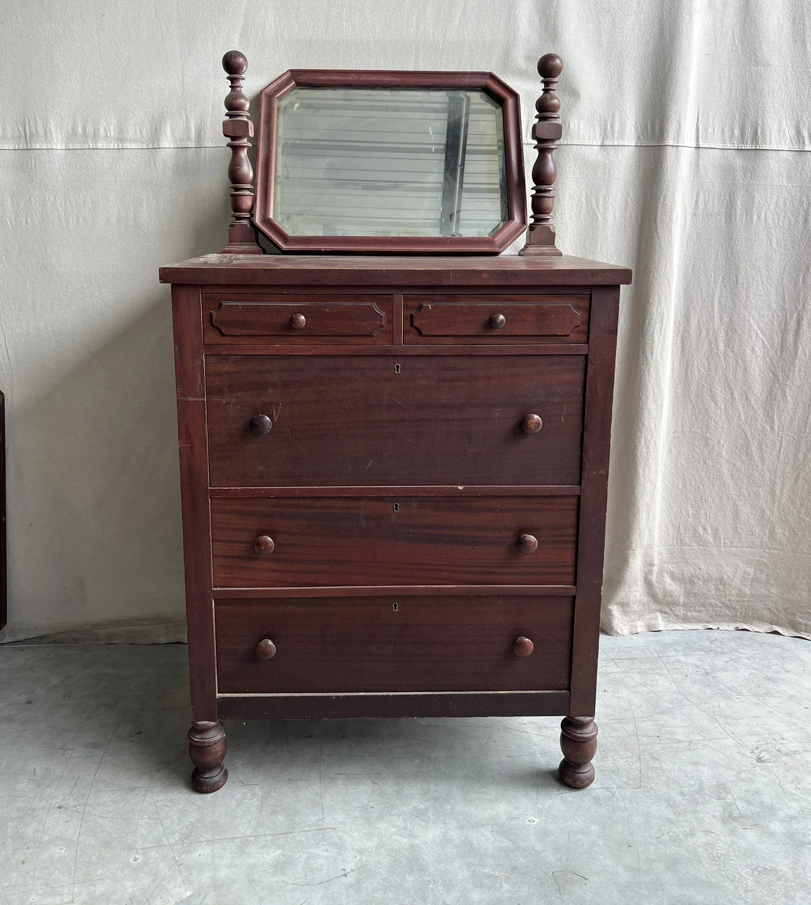 Antique solid wood chest of drawers with tilt mirror. Mirror does have some age spots but otherwise in good condition. Five drawers total, the bottom three have the original locks still intact but no skeleton key.