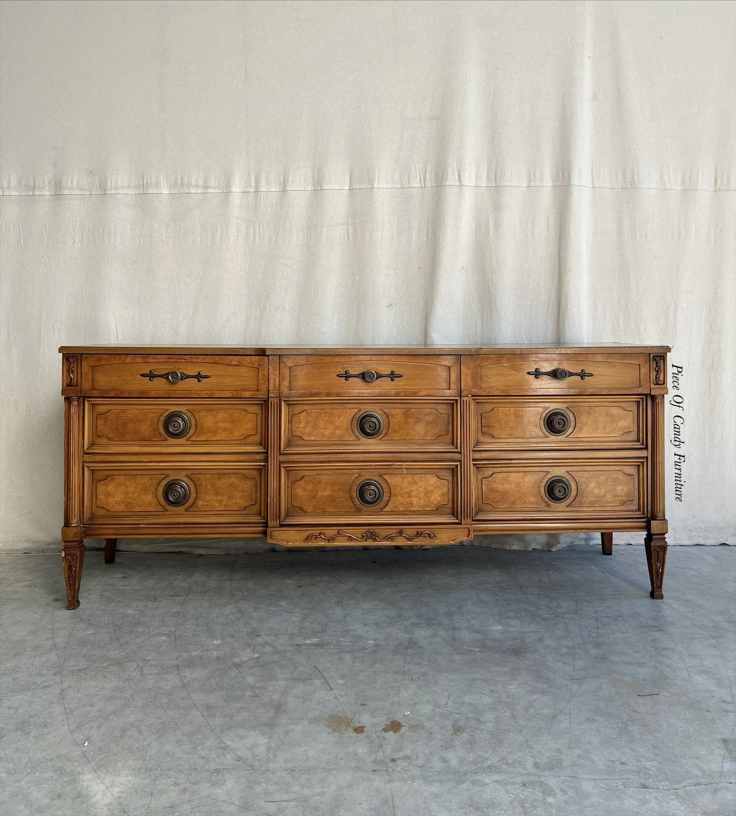 Italian provincial regency dresser has 9 dovetailed drawers. Painted in an olive color with gray undertones. Updated hardware with new antique brass fluted knobs. Top coated in a satin seal. Inner, outer, and cabinet area was conditioned in scented wood furniture oil. Drawer slides and rails were oiled as well for smooth opening and closing. We also added a new wood backboard.