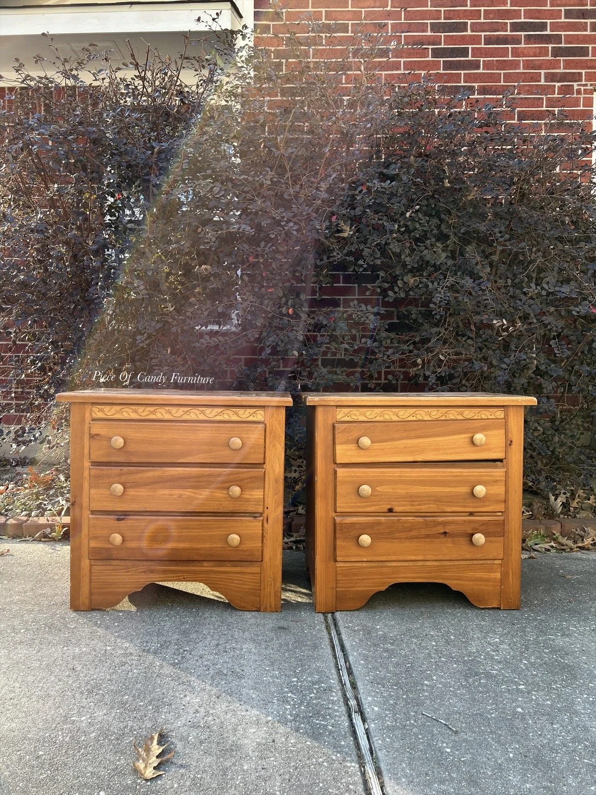 Vintage 1992 Kincaid Shaker Ridge three drawer nightstands. Solid wood and made in the USA. These were stripped to raw wood, stained in a warm brown, and sealed in a flat poly. Added antique brass rounded knobs to complete the modern look.