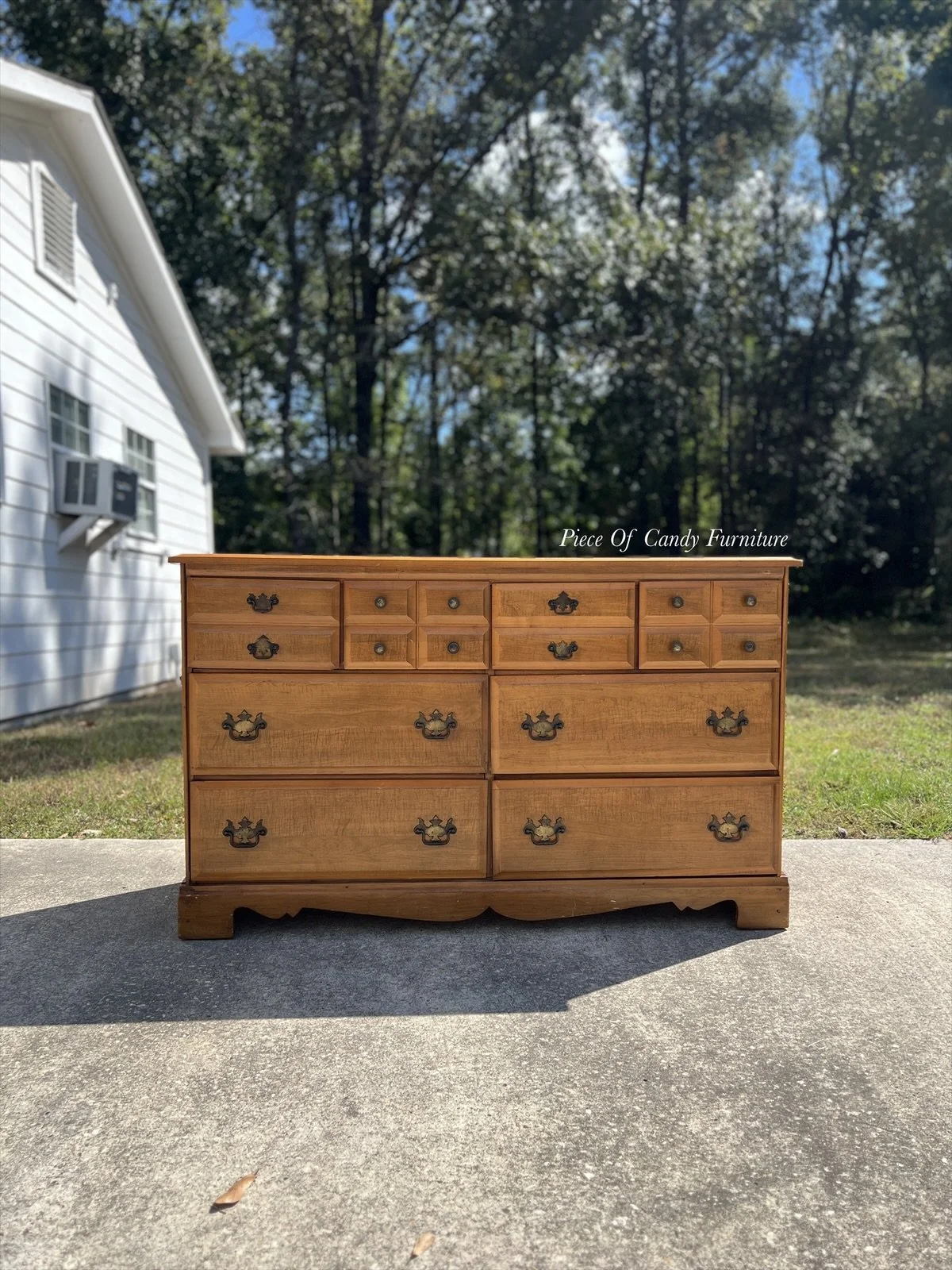 Refinished maple dresser in a warm brown stain, then top coated in a flat poly. Switched out hardware with modern antique brass cup pulls and knobs. Features eight dovetailed drawers and dresser is all solid maple.