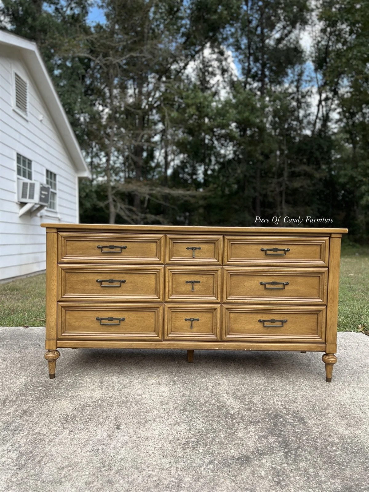 Vintage dresser made by White Fine Furniture. White fine furniture is well known for very high quality vintage furniture. Well made and features seven drawers. Painted in olive green and top coated in a satin poly sealer. Updated the original hardware with modern antique brass knobs and cup pulls. Inner and outer drawers are conditioned with scented furniture salve.